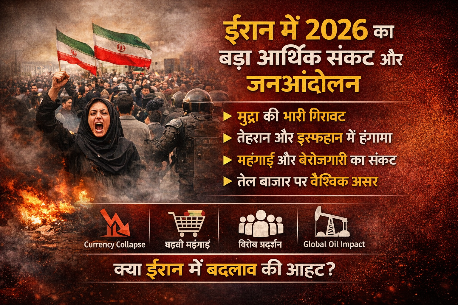 साल 2026 की शुरुआत में ईरान एक ऐसे आर्थिक और सामाजिक संकट से गुजर रहा है जिसने न केवल देश के अंदर बल्कि वैश्विक राजनीति और अर्थव्यवस्था में भी हलचल मचा दी है। राष्ट्रीय मुद्रा में ऐतिहासिक गिरावट के बाद राजधानी Tehran, औद्योगिक और सांस्कृतिक शहर Isfahan, और अन्य प्रमुख शहरी क्षेत्रों में व्यापक विरोध प्रदर्शन देखने को मिल रहे हैं।